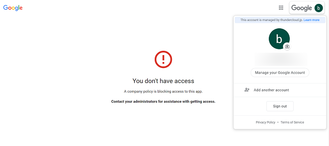 以下の画像はアクセス許可していないユーザーでGoogle Cloud コンソールにアクセスした場合の画面です。同じようにアクセスできないエラー画面が表示されます。