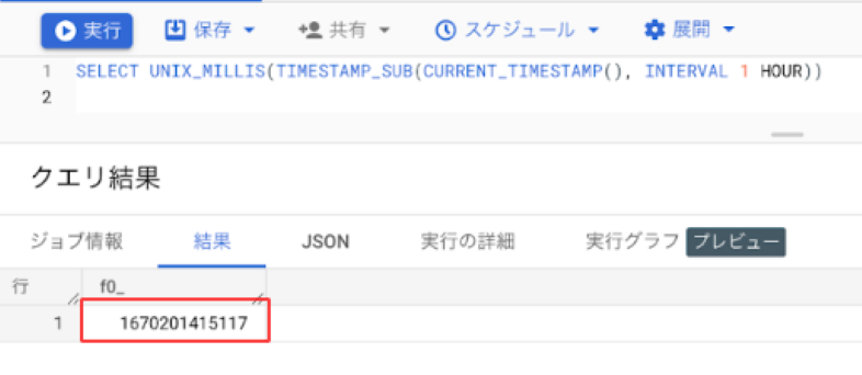 SELECT UNIX_MILLIS(TIMESTAMP_SUB(CURRENT_TIMESTAMP(), INTERVAL 1 HOUR))