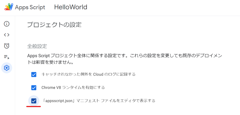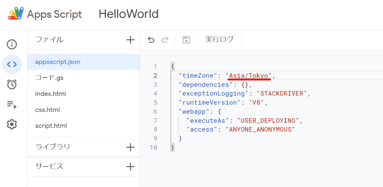 新しく表示された「appsscript.json」というファイルの「timeZone」という項目の内容を"Asia/Tokyo"に変更すると、日本時間で現在時刻を表示できます。