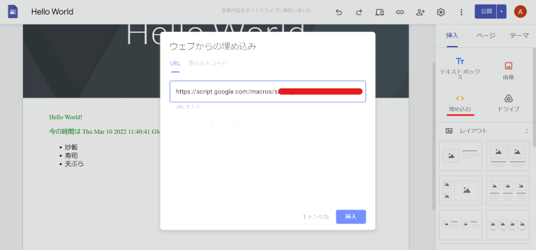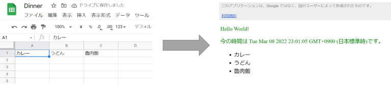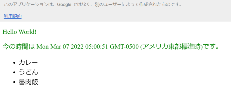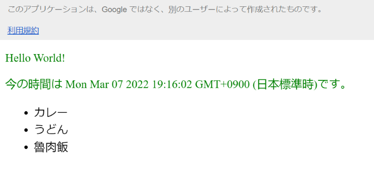 <!DOCTYPE html> <html> <head> <base target="_top"> <?!= include('css'); ?> </head> <body> <p>Hello World!</p> <p>今の時間は <?= new Date() ?>です。 </p> <ul> <? const data = ['カレー', 'うどん', '魯肉飯']; for (let i = 0; i < data.length; i++) { output._ = "<li>" output._ = data[i] output._ = "</li>" } ?> </ul> <?!= include('script'); ?> </body> </html>