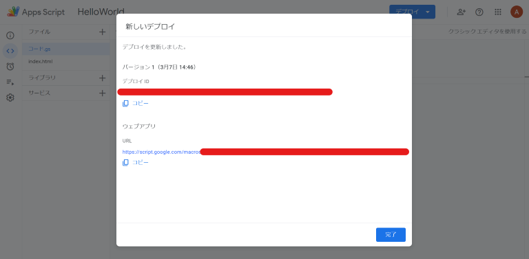 少し待つと、デプロイ成功の画面が見えました。これでWebページは無事に公開されたことになります。