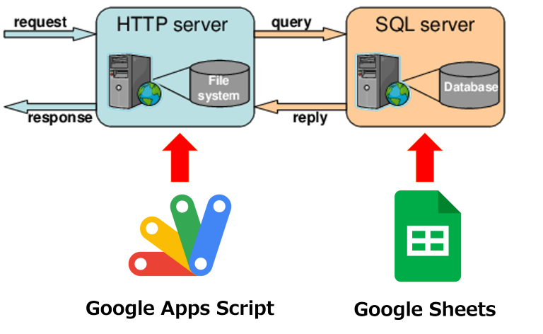 前文と同じ図になりますが、簡単に言うと、フロントエンドをGASに、バックエンドをGoogle Sheets (+ GAS)に置き換えればいいです。