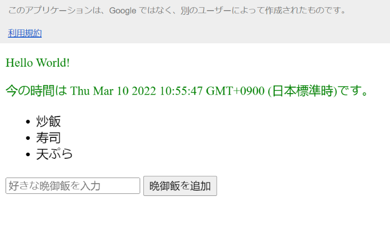 <!DOCTYPE html> <html> <head> <base target="_top"> <?!= include('css'); ?> </head> <body> <p>Hello World!</p> <p>今の時間は <?= new Date() ?>です。 </p> <ul id="dinners"> <? const data = getDinner(); for (let i = 0; i < data.length; i++) { output._ = "<li>" output._ = data[i] output._ = "</li>" } ?> </ul> <input type="text" id="dinner" placeholder="好きな晩御飯を入力" size="20" value=""> <button class="addDinner" type="button" onclick="addDinner()"> 晩御飯を追加 </button> <?!= include('script'); ?> </body> </html>