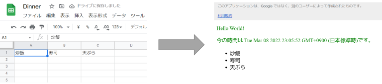 <? ... ?>の内部に、GASに記載されたJS関数を任意に呼び出すことが可能なので、const data = getDinner()によって、htmlにデータをハードコードすることを避けました。