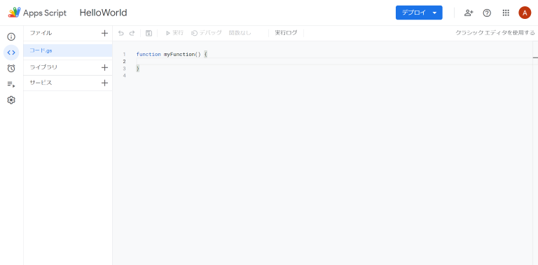 デフォルトで作られた「コード.gs」を開き、以下の内容を入力し、保存します。
