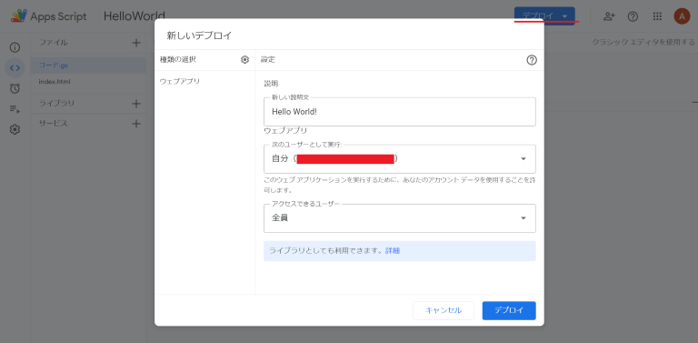 全てのファイルが保存されたことを確認し、右上の「デプロイ」ボタンを押し→「新しいデプロイ」を押すと、ポップアップウィンドウが表示され、必要なパラメータを入力し、右下の「デプロイ」を押す。