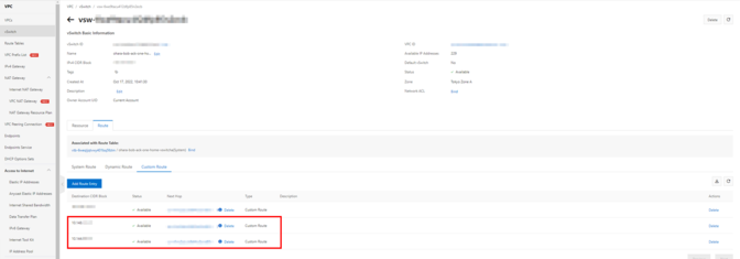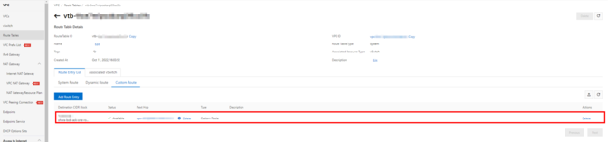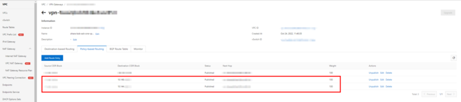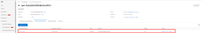 その後、Alibaba CloudのVPNコンソールに戻り、対象のVPN Gatewayの下にあるPolicy-based Routingを確認してください。公開されたルートエントリがあるはずです。