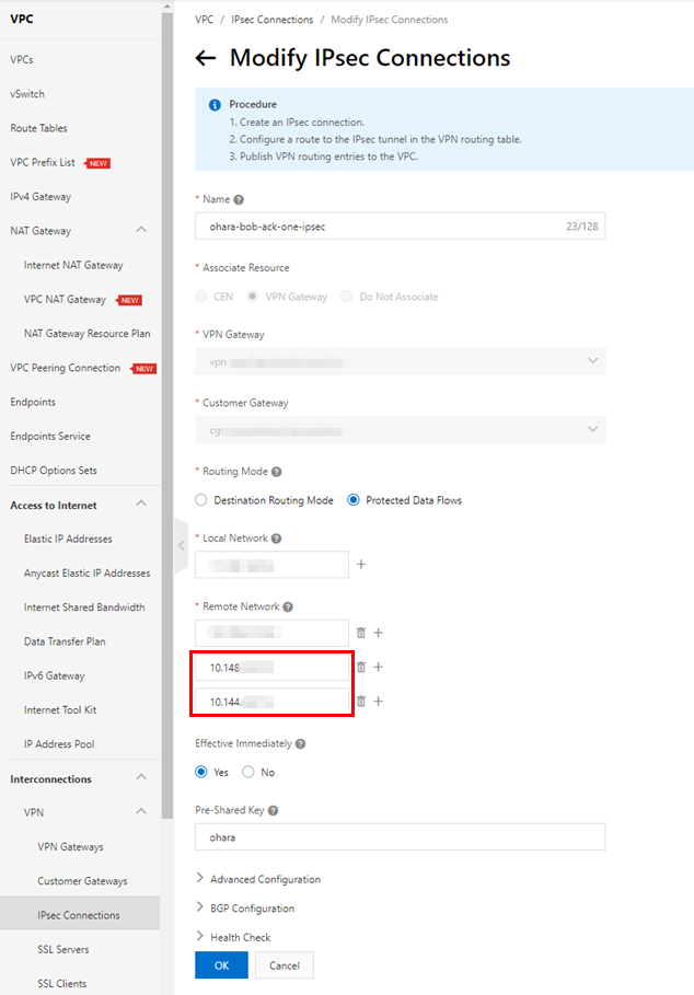 Alibaba CloudのIPsec接続を更新し、リモートネットワークオプションとしてこれら2つのIPレンジを追加します。
