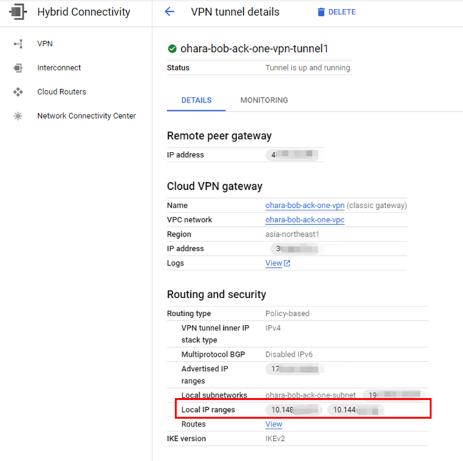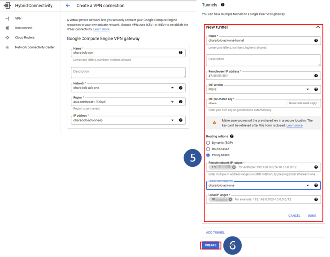 上記の手順で作成したVPCネットワークに基づいて、Local subnetworksとLocal IP rangesを設定します。