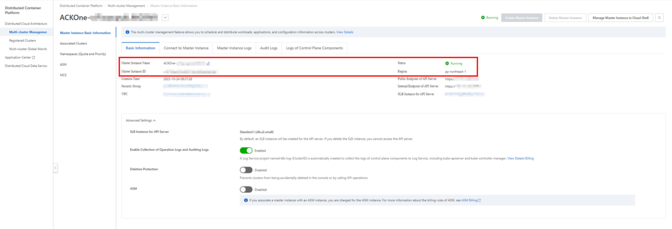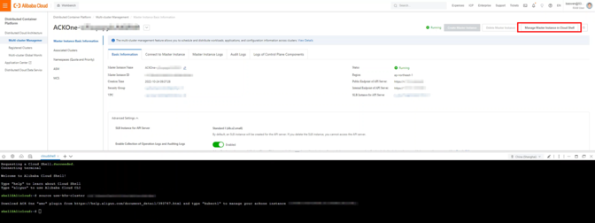ACK Oneコンソールの「Master Instance Basic Information」ページを開き、「Manage Master Instance in Cloud Shell」ボタンをクリックしてクラウドシェルを開きます。