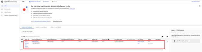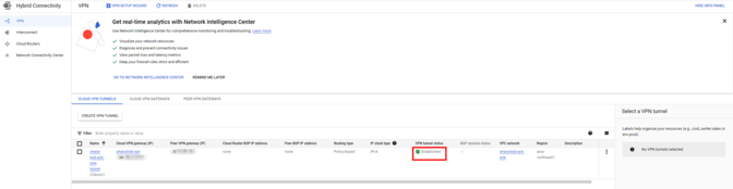 まずGoocle CloudのVPNトンネルの状態を確認します。Alibaba CloudでIPsec接続が正常に設定されたら、同時にGoocle CloudのVPNトンネルも「Established」に更新する必要があります。