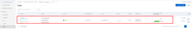 また、コンソールから直接リソースを確認することもできます。アプリケーションはAlibaba Cloud上のASKクラスタに配布されるため、対象クラスタの詳細ページには対象のデプロイメント、Pod、サービスが表示されるはずです。