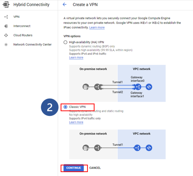 クラシックVPNモードを選択し、「Continue」ボタンをクリックすると、次のステップに進みます。