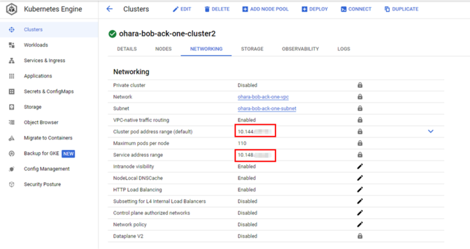GKEクラスタに設定されているPodやサービスのIPレンジを確認します。