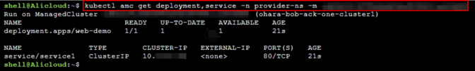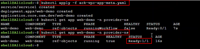 kubectl apply -f ack-vpc-app-meta.yaml kubectl get app web-demo -n provider-ns kubectl amc get deployment,service -n provider-ns -m <cluster ID>