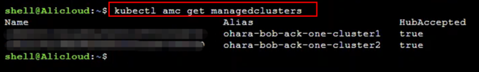 コマンドで管理されているクラスタを確認します。ACK Oneでクラスタの関連付けに成功した場合、ここに表示されます。