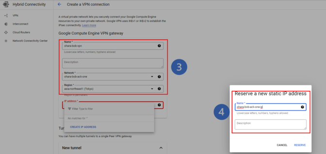 ターゲットVPN Gatewayとバインドするための新しい静的IPアドレスを予約します。これは、VPC NetworkコンソールのIPアドレスのページで別途作成することもできます。このIPアドレスは、今後使用するために覚えておいてください。