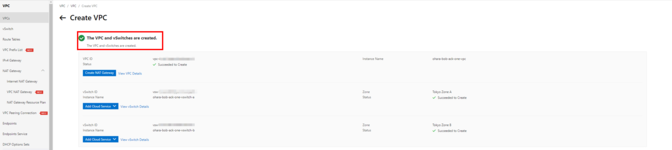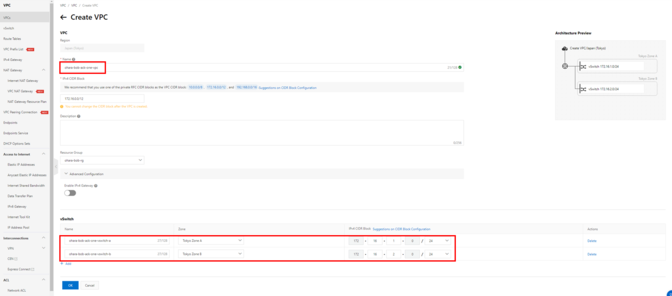 VPN Gatewayによるネットワーク接続を構築するために、Alibaba Cloud上でVPCとvSwitchを作成します。