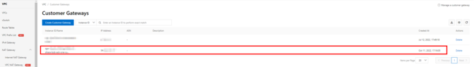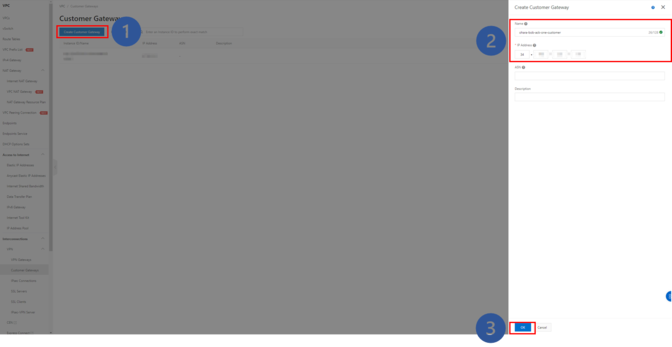 Alibabaコンソールの 「Create Customer Gateway」ボタンをクリックします。