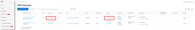 作成されたリソースを確認し、IPアドレスが生成されるのを待ちます。この時、VPN Gatewayインスタンスは「Active」になりますので、その時に表示されるIPアドレスをメモしておきます。このIPアドレスは今後利用します。