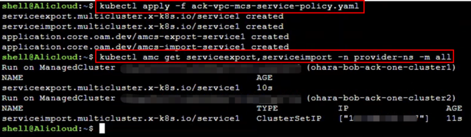 kubectl apply -f ack-vpc-mcs-service-policy.yaml kubectl amc get serviceexport,serviceimport -n provider-ns -m all