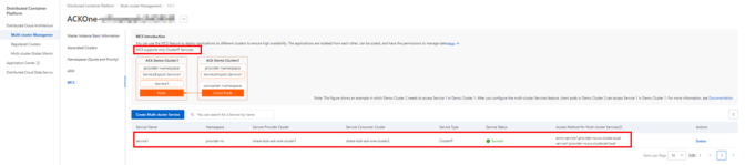 作成されたマルチクラスターサービスは、コンソールで確認することができました。ページの図は、Demo Cluster 2 がDemo Cluster 1 の Service 1 にアクセスする必要がある例です。