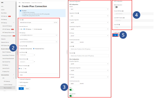 Remote peer IP addressは、Alibaba CloudのVPN Gatewayの生成された外部IPアドレスにします。