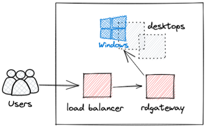 ① ユーザーはLoad Balancerを経由して、RD Gatewayと認証を行います。