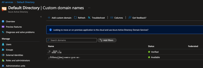 (1)事前にローカルADドメインをAzure Custom Domainに登録を行います。ドメイン認証が必要なので、Azure Portalの指示に従って認証を行い、Status欄にverifiedとなります。