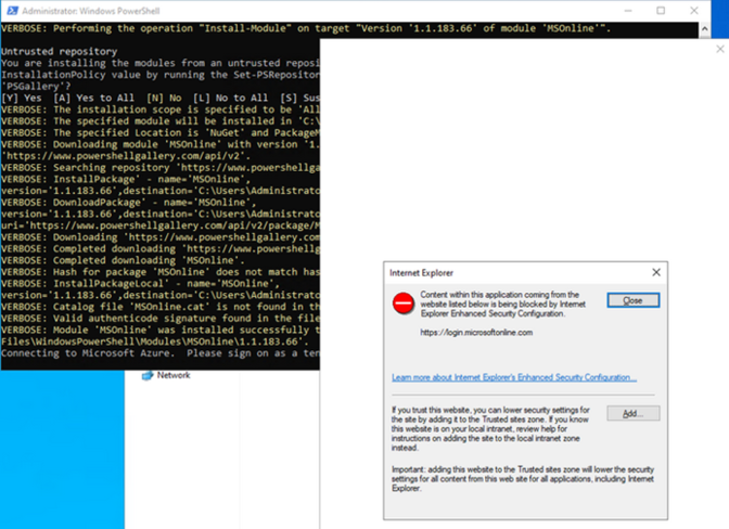 インストール中にAzure ADのGlobal Administrator権限を持つユーザーの認証情報求められますので、入力します。(事前にIEセキュリティ強化設定を無効にすることを推奨します。)