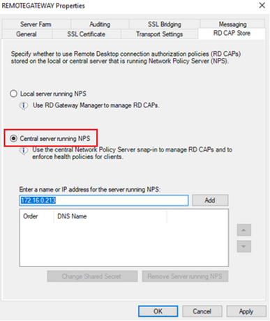 以下の図のようにRD GatewayのNPSサーバを独立したNPSサーバに設定します。