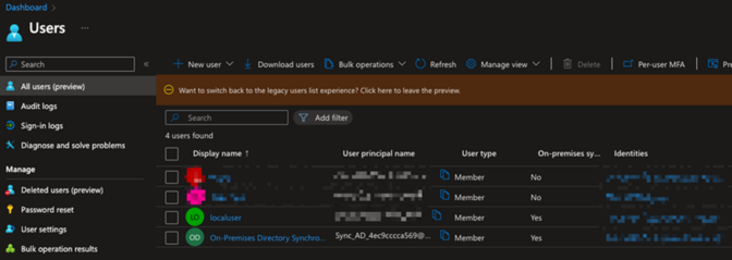 (5)全ての設定が終わった後、少し時間が経つと、Azure AD上にローカルADおよび指定の同期ユーザーが同期されます。