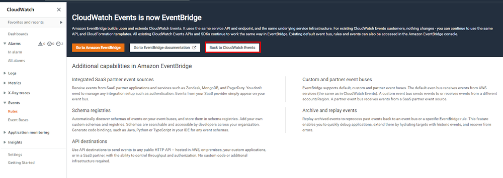 この関数コードを一定時刻にて実行し、slackへ天気予報情報を通知するように設定したいので、AWS側でタイマートリガーを設定します。まずはCloudWatch Event画面へ遷移し、「Back to CloudWatch Events」をクリックします。