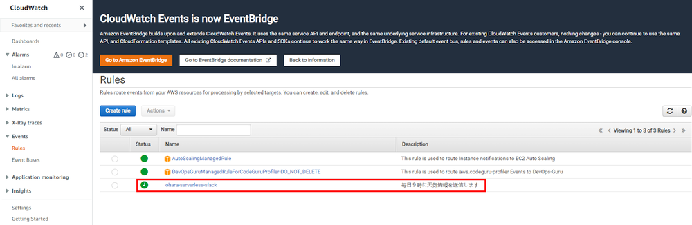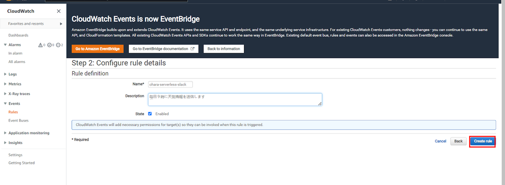 これで毎日朝9時に天気予報をSlackへ通知するトリガーのCloudWatchEvent設定が完了です。この設定によって毎日朝9時に天気予報情報を自動的に発信できるようになります。