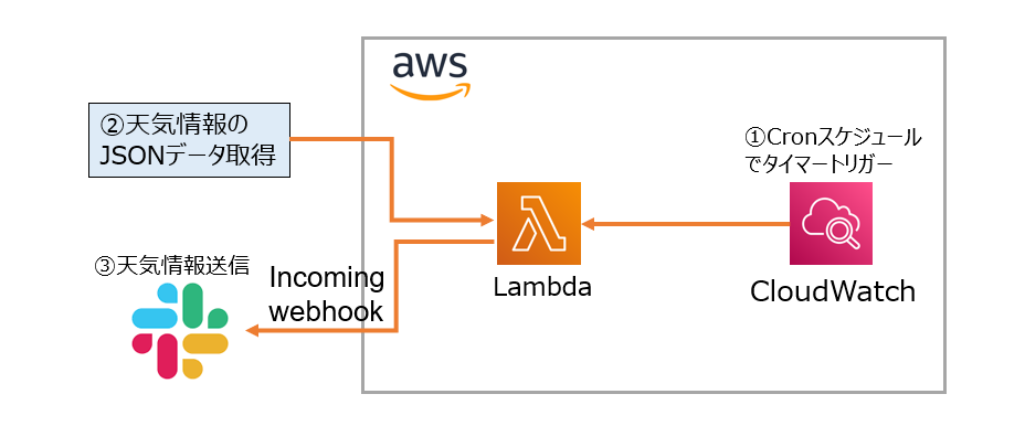 全体構成図は次の通りになります。ゴールは一定時刻になると天気予報を通知するものです。
