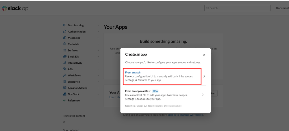 ワークスペースが完成したら、今度はそのワークスペースとFunctionComputeを連携するための、Slackアプリ設定をします。