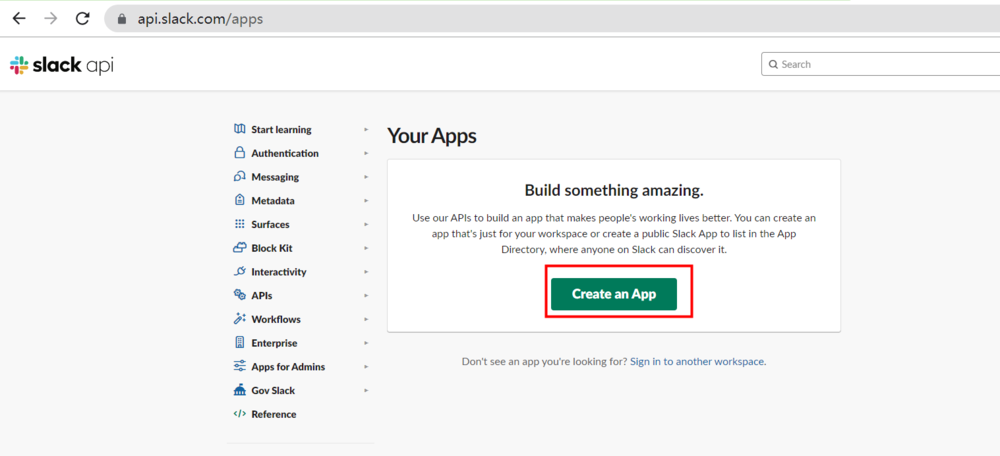 https://api.slack.com/apps にアクセスし、「Create an APP」をクリックしてSlackアプリを作成します。