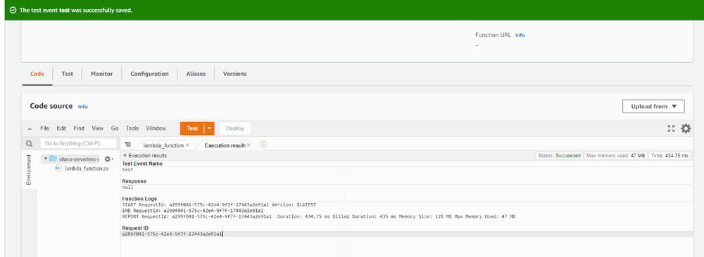 今回の関数コードはJSONによる入力が不要なので、このままSave changesをクリックして保存し、Test eventの設定を完了します。