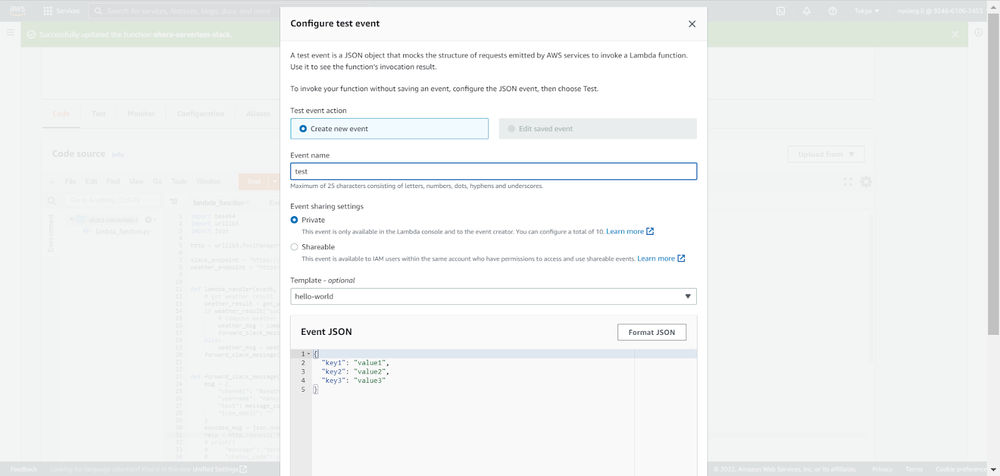 テストイベントはJSONによるデータ入力からコード関数が実行されます。もしデータ入力が不要な関数コードの場合、イベントは空のドキュメント{{}} に設定することもできます。
