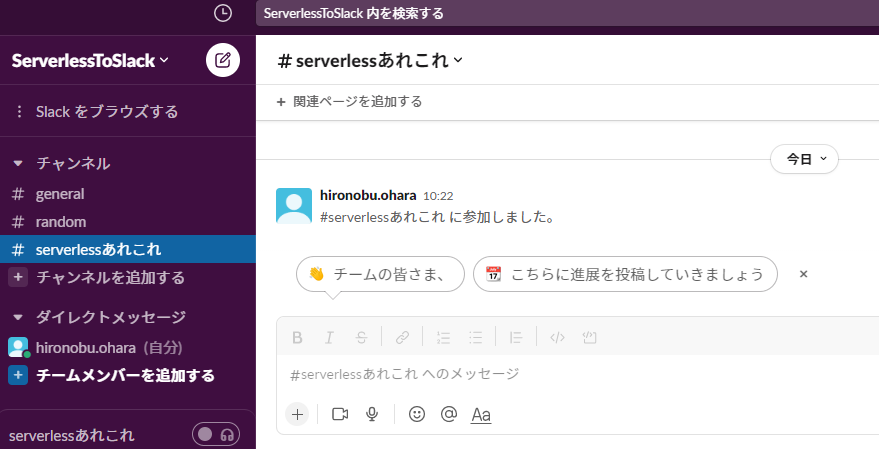 今回はワークスペース名を「ServerlessToSlack」という名前にします。