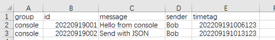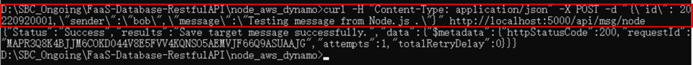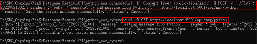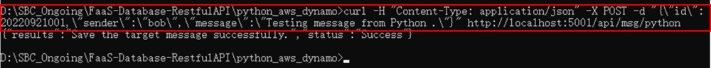 curl -H "Content-Type: application/json" -X POST -d "{\"id\": 20220921002,\"sender\":\"bob\",\"message\":\"2nd message from Python .\"}" http://localhost:5001/api/msg/python