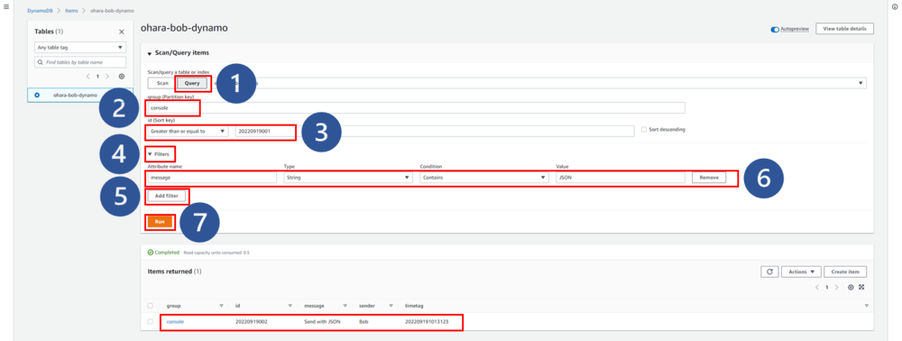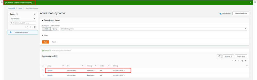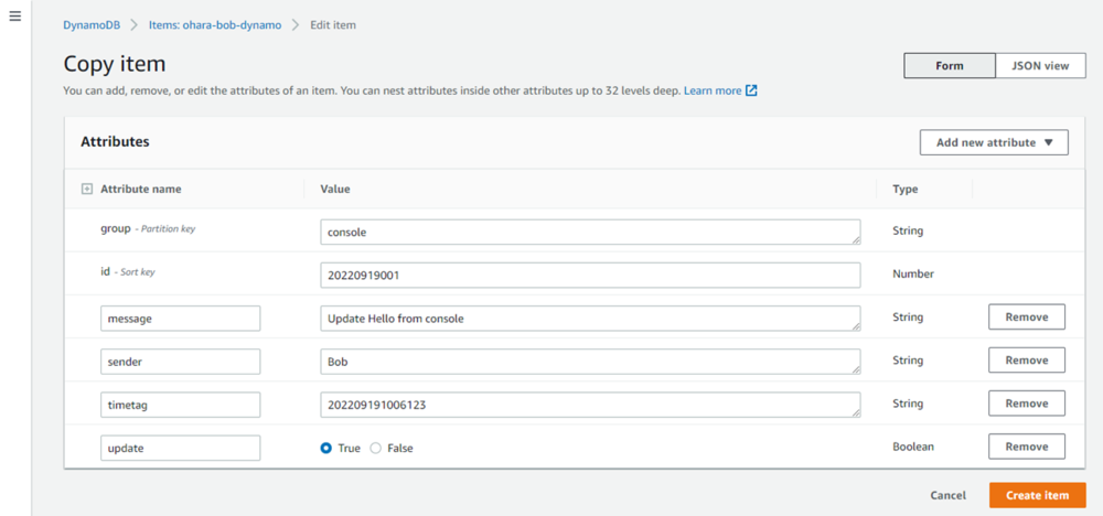 aws dynamodb put-item --table-name ohara-bob-dynamo --item '{ "group": {"S": "CLI"},"id": {"N": 20220920001},"sender": {"S": "Bob"},"message": {"S": "From CLI"},"timetag": {"S": "202209201400123"} }' --return-consumed-capacity TOTAL