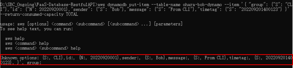 Unknown options: {"S":, "CLI"},"id":, {"N":, 20220920001},"sender":, {"S":, "Bob"},"message":, {"S":, "From, CLI"},"timetag":, {"S":, "202209201400123"}, }', "group":