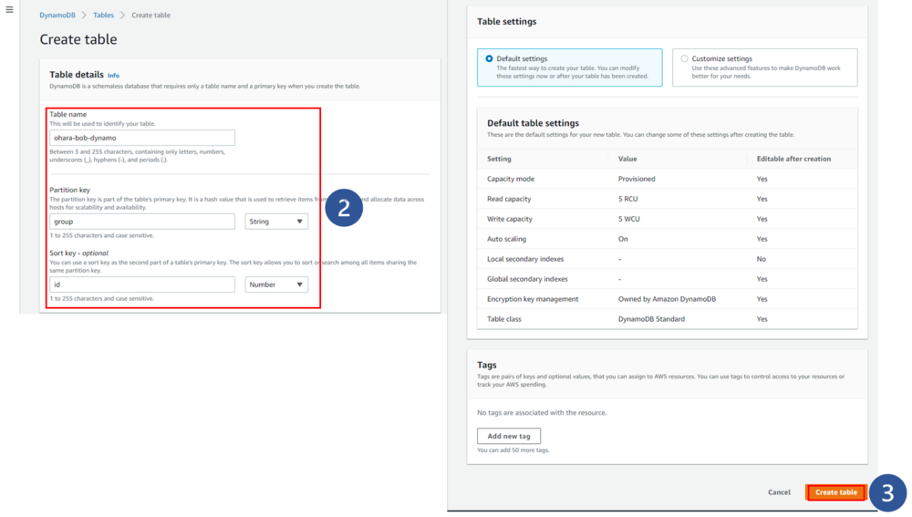 テーブル名とキーの設定値を入力します。