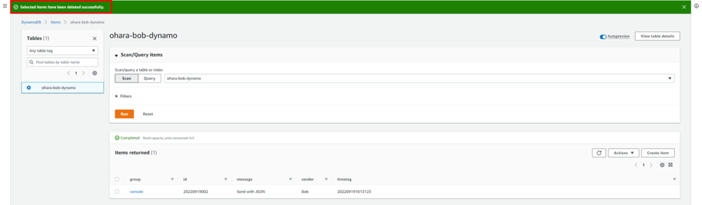 テーブルから項目を削除し、get-itemとスキャン操作でデータを確認します。