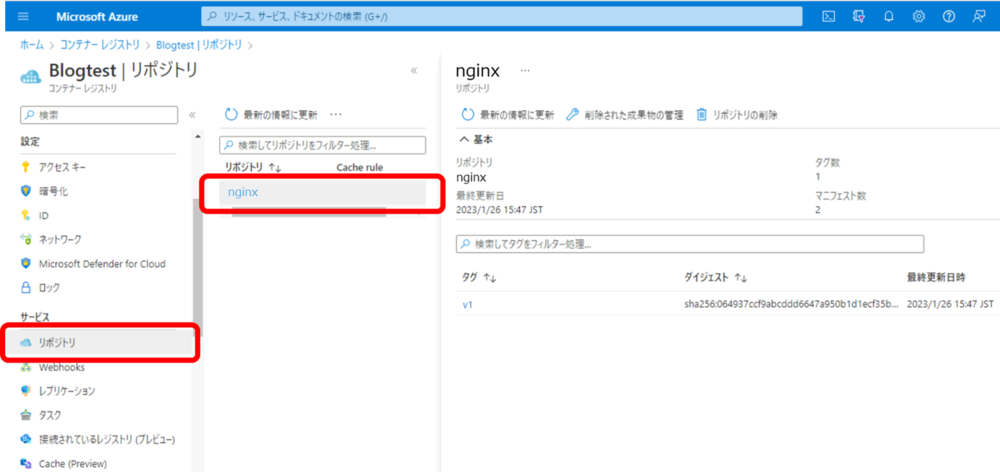 Azure portalでのイメージ格納状態を確認します。ACRのブレードにある[リポジトリ]から先ほど作成したイメージを選択し、名前とタグがあるか確認します。