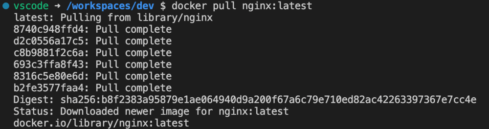 Dockerコマンドによるnginx の最新イメージを取得します。