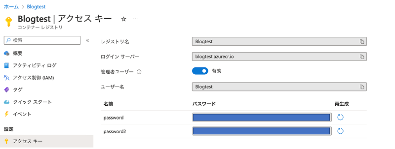 次に、クレデンシャル情報を取得します。ACRのブレードにあるアクセスキーにて、ログインサーバ名とpasswordを控えておきます。