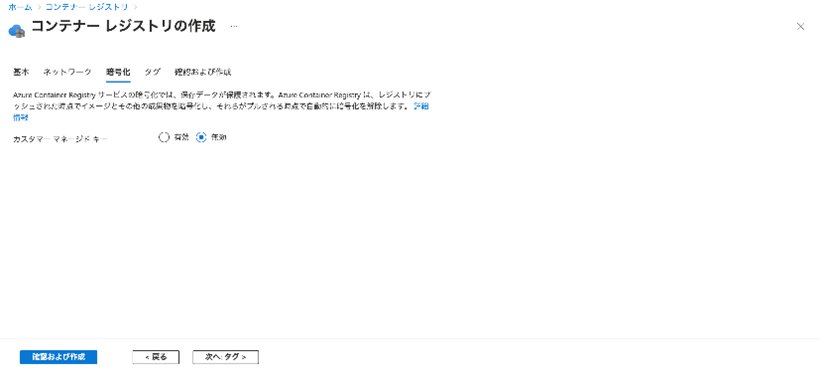 暗号化の設定ではカスタマーマネージドキーを使うか聞かれます。