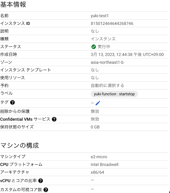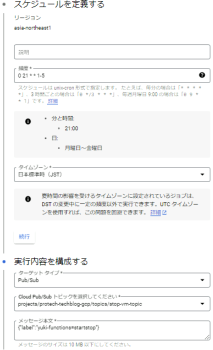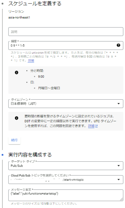 メッセージ本文 : {"label":"[VMインスタンスにつけたラベル名]=startstop"}
